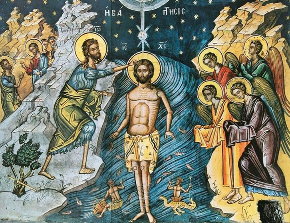 Prema Svetom Pismu, Isusa Hrista je na reci Jordan krstio Jovan Krstitelj. Tokom krštenja, nebesa su se otvorila, Sveti Duh se spustio u obliku goluba, a glas Boga Oca objavio je: „Ovo je Sin moj ljubljeni, koji je po mojoj volji“. Ovaj događaj simbolizuje početak Hristove javne službe i predstavlja jedno od najvažnijih otkrivenja Trojstva.